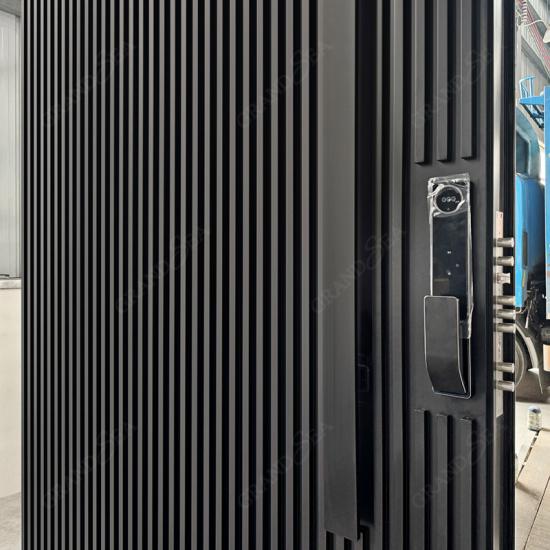 باب محوري أمامي لفيلا سكنية، بتصميم أنيق من الألومنيوم، لون أسود، ارتفاع 4 أمتار