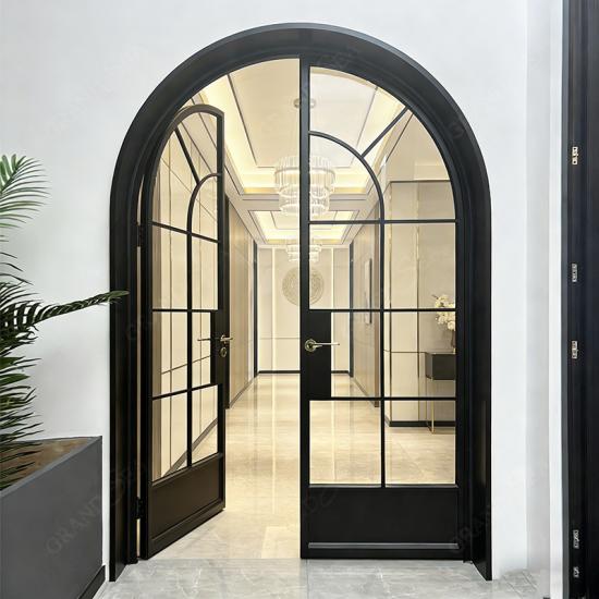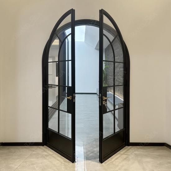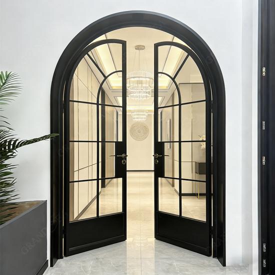 أبواب فرنسية فاخرة مقوسة من الألومنيوم، إطار أسود، باب أمامي مزدوج من الزجاج المقوى